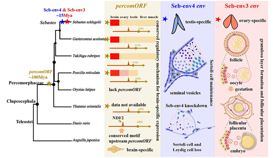 Genes Drive Teleost Physiological Innovations”(超越胎生:内源性逆转录病毒包膜基因推动真骨鱼类多元生理性状的演化革新)的研究论文。该研究以许氏平鲉为模型,不仅在硬骨鱼类中锁定了驱动胎生起源的候选病毒基因,更意外发现被宿主“驯化”的病毒基因并未止步于胎盘,而是深度参与了神经系统发育与雄性生殖调控。这项工作揭示了内源性逆转录病毒作为“演化引擎”,在推动脊椎动物复杂性状演化中的多维作用。