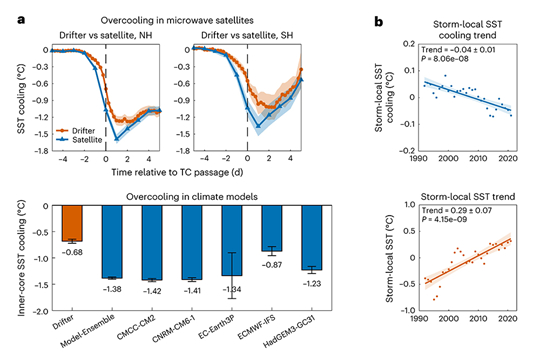 基于表面漂流浮标观测数据,在天气尺度上,研究团队量化了台风内核区海表面降温平均值为-0.68± 0.04℃,这是自1950s提出台风会引起海表面降温概念以来,首次基于现场观测在全球尺度上刻画内核区海表面降温幅度和空间特征。对比上述量化结果,发现卫星微波遥感观测的内核区海表面降温(-1.05±0.06℃)存在显著冷偏差,高估内核区降温约55%;这种冷偏差同样存在于目前主流的气候模式中(-1.38±0.02℃,高估100%)(图2a)。模式敏感性实验表明,对冷偏差进行校正后,台风强度模拟误差可降低——40%,由此可见,冷偏差是导致当前主流海气耦合模式系统性地低估台风强度的关键原因之一。在气候尺度上,研究团队发现尽管全球变暖期间海洋层结增强导致台风内核区海表面降温有所加强,内核区海表面温度仍以每十年0.29± 0.07℃的趋势快速增加,其速率约为热带海洋平均增暖趋势的两倍,为海洋增暖驱动台风增强趋势提供了直接观测依据(图2b)。该发现表明,台风更易发生在比热带平均变暖更快的海域,这可能是因为大气增暖相对均匀,而海洋中增暖更快的区域更有利于深对流发展,从而促进强台风的生成。这一研究成果为天气和气候模式提供了关键的观测基准,并表明现有模式预测可能低估了未来强台风的强度与发生频率,也低估了其对极端降雨、海平面升高及社会经济损失的潜在影响。