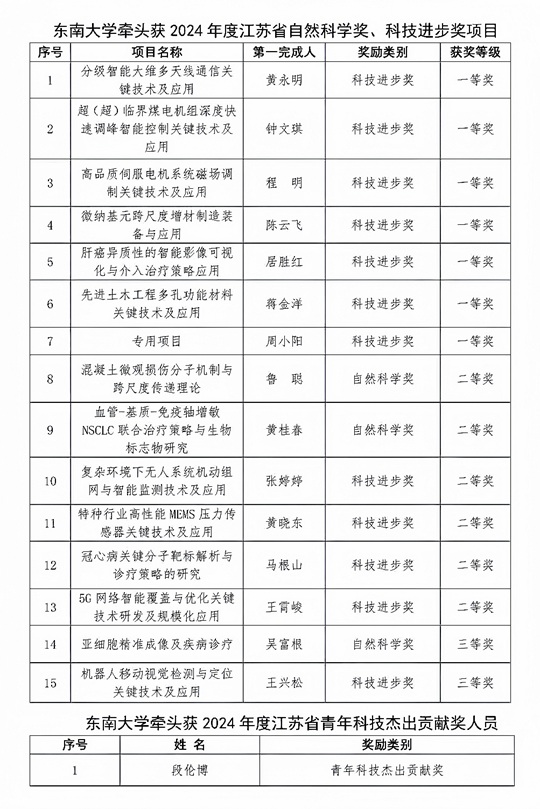 1月23日,江苏省政府网站发布《省政府关于2024年度江苏省科学技术奖励的决定》,东南大学获江苏省科学技术奖50项,其中牵头获一等奖7项、二等奖6项、三等奖2项、青年科技杰出贡献奖1项,牵头获一等奖数量连续七年全省高校第一。