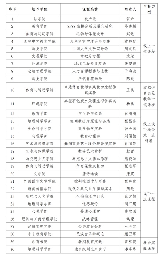 近日,教育部发布《关于公布第三批国家级一流本科课程认定结果的通知》,北京师范大学30门课程入选,其中,线上一流课程9门、线下一流课程11门、线上线下混合式一流课程6门、虚拟仿真实验教学一流课程2门、社会实践一流课程2门。截至目前,北师大累计有115门课程入选国家级一流本科课程。