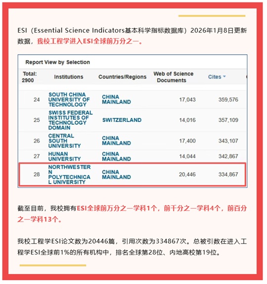 西北工业大学工程学进入ESI全球前万分之一!