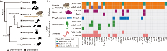 networksunderlying biomineralized skeletons in Bilateria”(两侧对称动物生物矿化骨骼保守基因调控网络中的演化创新)的研究论文。该研究以牡蛎为模型,系统构建了幼虫初生壳与成贝次生壳形成过程中的染色质状态景观和基因调控网络,提出了以保守基因调控网络为核心、染色质动态重塑驱动表型创新的演化模型。