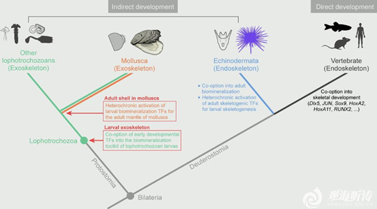 图2. 两侧对称动物不同生命阶段中转录因子工具包被选配参与矿化骨骼形成的演化模式