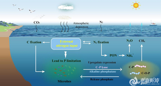甲烷(CH4)是重要的温室气体,其温室效应是CO2的二十多倍,减少全球甲烷排放是推进气候治理与实现碳中和目标的重要途径。海洋是大气中甲烷的来源之一,每年向大气释放约6–12TgCH4。作为表层海洋营养盐输入的重要来源,大气沉降能够显著影响上层海洋生物地球化学循环,但其对海洋甲烷的产生及释放过程的影响机制却未被认识。研究团队聚焦富氧上层海洋中甲基膦酸盐降解导致的有氧产甲烷途径,即在磷限制条件下,微生物可通过降解甲基膦酸盐获取可利用的磷,并在碳—磷(C–P)键裂解过程中产生副产物甲烷,基于原位观测、培养实验、生物信息学分析、机器学习等一系列跨学科交叉技术手段,发现过量大气氮沉降显著提高了表层海水氮磷比例,加剧了磷限制,从而促进微生物通过甲基膦酸盐降解释放甲烷。在此基础上,整合了全球表层海洋宏基因组数据以及环境因子数据库,利用随机森林回归模型构建并预测了C-P裂解通路关键基因的全球分布格局,定量估算了大气氮沉降对海洋甲烷产生和释放的影响。结果表明,大气氮输入导致全球表层海洋C-P裂解通路关键基因的丰度提高12.5–18.6%,并且升高的N:P比可导致全球表层海水甲烷产生速率显著增加。未来情景下,2025−2050年期间由大气氮沉降驱动的全球表层甲烷释放达0.22Tg,占全球开阔大洋甲烷年释放通量的14.3%–33.3%。这些结果表明大气沉降通过改变营养盐结构,能够促进全球海洋甲烷的产生及释放,从而部分抵消其导致的固碳效应,揭示了海洋大气沉降、营养盐循环与温室气体生成之间更为复杂的反馈关系。