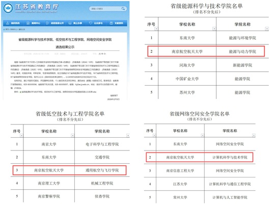 近日,江苏省教育厅公布了新一轮省级专业特色学院立项建设名单。南京航空航天大学申报的省级能源科学与技术学院、省级网络空间安全学院、省级低空技术与工程学院全部成功入选,此次全省共立项建设省级能源科学与技术学院13个、省级低空技术与工程学院10个、省级网络空间安全学院9个。