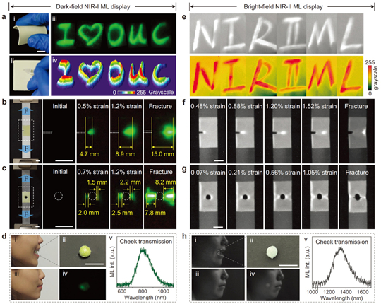 图1. 近红外应力发光在暗场和明场环境下的应力分布可视化和生物力学成像实验展示