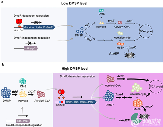 该研究首次阐明海洋玫瑰杆菌中DMSP两条竞争代谢途径的协同调控机制,揭示为海洋细菌响应DMSP浓度变化、平衡抗逆与代谢利用的分子机制,填补了海洋DMSP代谢调控机制空白,为解析海洋硫循环与全球气候变化的关联提供重要依据。