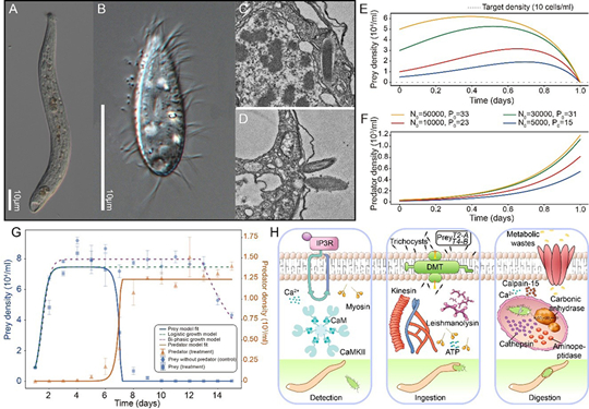 研究团队通过捕食实验与生态模型模拟发现,贪食纤口虫具有极高的捕食效率,仅需几十个体即可在短时间内显著抑制病害纤毛虫种群。研究进一步揭示了其捕食行为涉及细胞骨架重塑、蛋白酶解系统、毒素外排机制等多生物学功能的协同作用,表现出高度协调的捕食适应策略。