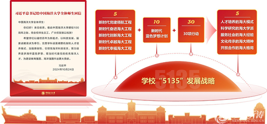 2024年10月24日,在中国海洋大学建校100周年之际,习近平总书记给学校全体师生回信,希望学校“以建校百年为新起点,以科技发展、国家战略需求为牵引,完善学科设置调整机制和人才培养模式,加强原创性、引领性海洋科技攻关,努力培养更多胸怀蓝色梦想、堪当时代重任的优秀海洋人才,为建设教育强国、海洋强国作出更大贡献”。习近平总书记的重要回信为学校发展指明了前进方向,提供了根本遵循,注入了强大动力。
