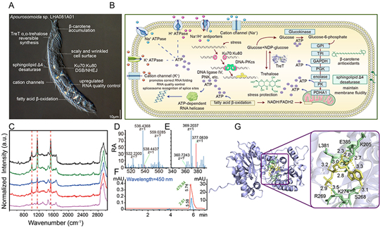 为了解开这一抗逆之谜,研究团队解析了其特殊的“纳米染色体”(nanochromosomes,一条染色体只携带1–2个基因)基因组,并找到了关键的“抗压神器”——TreT酶。演化分析显示,在约6215万年前,其祖先通过“水平基因转移”,从一类严格厌氧嗜盐细菌脱硫杆菌中“借”来了该基因。TreT酶能够介导海藻糖(α,α-trehalose)的合成(一种天然蛋白质稳定剂),在绝大多数其他纤毛虫中未见报道,却是抵御多重环境胁迫的关键所在。