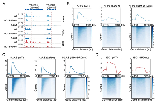 图3. IBD1的溴结构域介导H2A.Z的添加。(A)代表性基因位点上ARP6、H2A.Z和IBD1的分布;(B-C)ΔIBD1和IBD1-BRDmut中,ARP6和H2A.Z在基因区5′端的富集均降低;(D)IBD1-BRDmut中,IBD1在基因区5′端的富集降低。