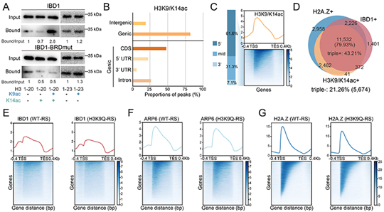 图4. 组蛋白乙酰化通过溴结构域介导的识别促进H2A.Z在染色质上的添加。(A)体外纯化的IBD1蛋白通过BRD偏好性识别H3K9/K14ac;(B)H3K9/K14ac主要富集于基因区;(C)H3K9/14ac倾向于富集在基因区的5′端;(D)H2A.Z(H2A.Z+)、IBD1(IBD1+)和H3K9/K14ac(H3K9/K14ac+)富集的基因高度重叠;(E-G)H3K9Q-RS中IBD1、ARP6和H2A.Z在基因区5′端的富集均降低。