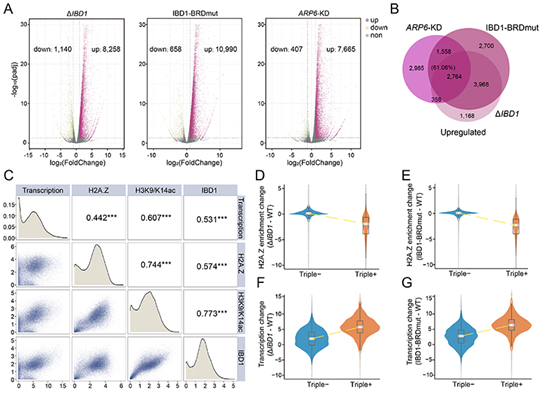 图5. H2A.Z与组蛋白乙酰化协同调控转录并防止过度激活。(A)ΔIBD1、IBD1-BRDmut和ARP6-KD中,转录大范围上调;(B)ΔIBD1、IBD1-BRDmut和ARP6-KD中转录上调的基因高度重叠;(C)H2A.Z、IBD1、H3K9/K14ac富集水平与基因表达水平呈正相关;(D-E)ΔIBD1和IBD1-BRDmut中,同时富集H2A.Z、IBD1和H3K9/K14ac的基因(triple+)以及缺失这三种标记的基因(triple-)的H2A.Z富集变化;(F-G)ΔIBD1和IBD1-BRDmut中,triple+与triple-基因的转录水平变化。