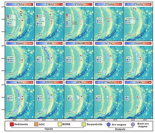 大量研究表明,弧下和弧后岩浆体系普遍表现出高于洋中脊玄武岩(MORB)的氧化状态,但其成因机制仍存在显著分歧。一种观点认为,俯冲板片在脱水及部分熔融过程中释放的氧化性流体或熔体,是导致弧下地幔及其岩浆体系氧化的主要来源;另一种观点则认为,弧区岩浆的高氧化状态主要受控于岩浆分异与演化过程,俯冲板片的直接贡献相对有限。因此,亟需对俯冲板片不同单元在不同深度贡献的氧化还原收支(redox budget)进行定量化估算。