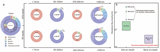 定量计算表明,仅约四分之一至三分之一的净氧化还原通量在弧相关阶段释放,其余——70%随俯冲板片进入深地幔,可能对地幔长期氧化演化具有重要影响(图4)。