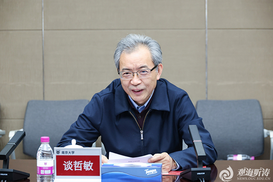 谈哲敏对张峻峰一行的到来表示欢迎。他指出,中国海洋大学和南京大学同为高水平大学群体的一员,习近平总书记在海大百年华诞和南大建校120周年之际,分别给两校发来重要回信,肯定两校办学成就并寄予殷切期望。两校校风相通、情谊深厚、合作密切,期待以本次签约为契机,充分发挥南大的综合性学科优势与海大的海洋特色优势,全方位深化合作,共同培养拔尖创新人才,为国家和区域发展提供人才支撑,携手服务国家重大战略与区域高质量发展。