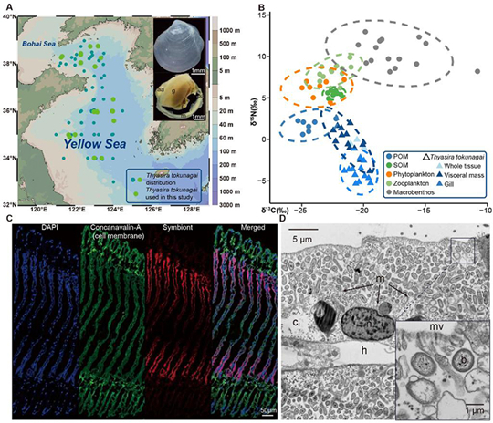 化能共生是海洋生态系统中普遍存在的“宿主—微生物”协作范式,常见于深海热液、冷泉等极端环境中,然而浅海富含有机物沉积环境中的化能共生机制及其相应的生态地位仍不清楚。近日,中国海洋大学生物多样性与进化研究所孙进教授课题组与海洋化学理论与工程技术教育部重点实验室庄光超教授课题组在Science Advances(《科学进展》)杂志发表题为“Intricate chemosymbiosis in a widespread shallow-water thyasirid clam”(浅海广布种索足蛤中复杂的化能共生机制)的研究成果。