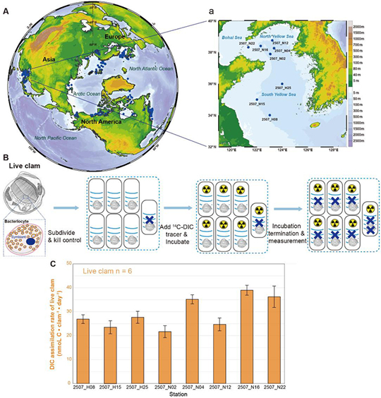 核心研究发现如下:该贝类鳃组织中存在两类共生硫氧化细菌(分属同一物种的两种系统型),以胞外定殖模式形成稳定共生关系,分类学上归属于Sedimenticola属;二者仅在16S rRNA基因第590位存在G/A单碱基差异,空间分布上呈现明显异质性,但基因组层面的代谢通路高度保守,与宿主形成紧密的代谢耦合网络(图2)。功能解析表明,共生细菌可利用宿主微生境中的硫化物作为能量来源,通过卡尔文循环高效固定无机碳,合成有机物、氨基酸及维生素等营养物质,供自身与宿主共同利用;而宿主则采用“沉积摄食+化学共生”的混合营养策略,实现营养获取的互补与高效化。进一步,研究团队创新采用“活贝共生体(宿主—微生物复合体)原位环境模拟”技术,结合高灵敏度¹⁴C示踪法,精准量化得出(图3):薄索足蛤的平均碳固定速率达29.3±8.7 nmol C・clam⁻¹・day⁻¹,单只碳固定能力相当于370毫升底层海水的水平。基于该实测数据,运用克里金插值法估算,黄海薄壳索足蛤种群的年碳汇量约为2.74 Gg C・yr⁻¹,为浅海生态系统碳循环贡献提供了关键量化依据。