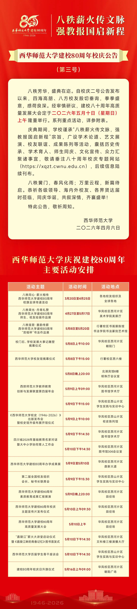 西华师范大学建校80周年校庆公告(第三号)