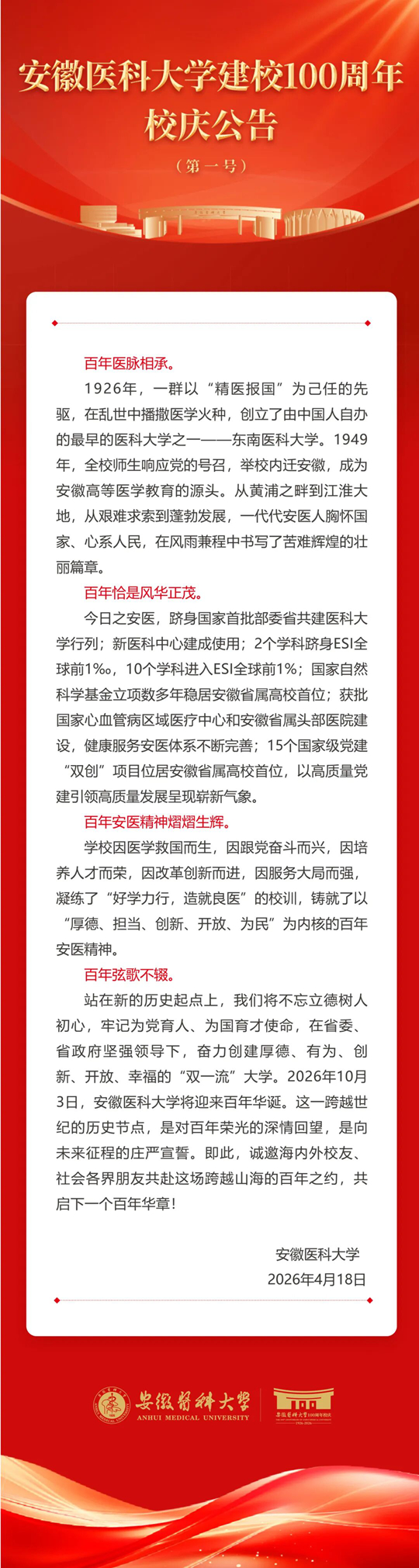 安徽医科大学建校100周年校庆公告(第一号)