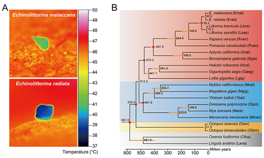 全球变暖背景下,揭示生物应对极端高温的适应机制是当前生物学的重要科学问题,而结节滨螺属(Echinolittorina)物种为研究这一问题提供了理想模型。这些生活于潮间带高潮区的小型贝类(成体大小通常不足一厘米)是目前已知耐热能力最强的动物类群之一:为应对栖息地内严酷的高温环境,它们演化出了极强的耐热性,致死温度可高达55°C。然而,由于缺乏基因组数据,这些物种适应极端高温的基因组学机制尚未被系统解析。针对这一研究空白,研究团队构建了结节滨螺属的首批染色体水平基因组资源,研究对象包括广布于我国沿海的粒结节滨螺(E. radiata)和分布于长江以南沿海的塔结节滨螺(E. malaccana)。通过比较基因组分析、多组学联合分析与细胞功能实验,首次为结节滨螺属物种的极强耐热性提供了基因组水平的证据。
