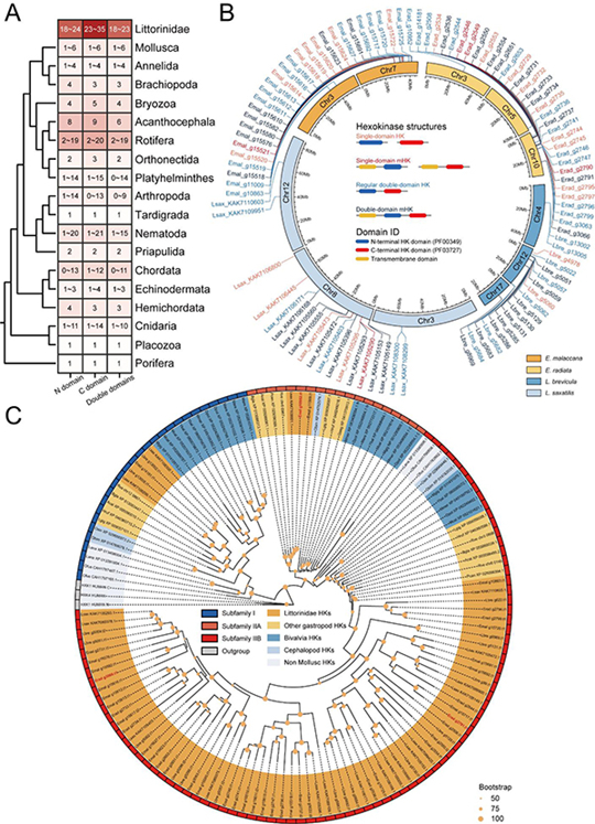 图2.(A)HK基因家族及数目在动物中的分布;(B)HK基因在四种滨螺亚科物种基因组上的定位;(C)基于ML树的贝类HK家族成员的聚类结果。