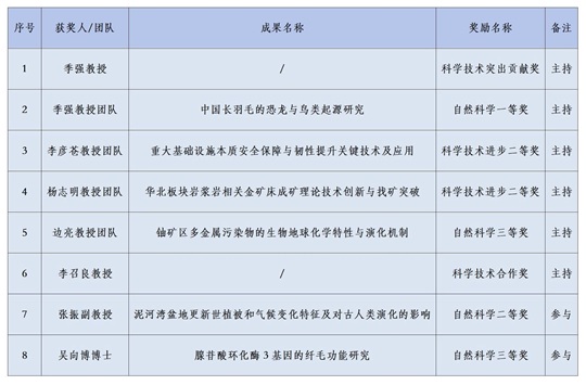 同时,季强教授团队主持完成的项目“中国长羽毛的恐龙与鸟类起源研究”获得省自然科学一等奖;李彦苍教授团队主持完成的项目“重大基础设施本质安全保障与韧性提升关键技术及应用”和杨志明教授团队主持完成的项目“华北板块岩浆岩相关金矿床成矿理论技术创新与找矿突破”获得省科学技术进步二等奖;边亮教授团队主持完成的项目“铀矿区多金属污染物的生物地球化学特性与演化机制”获得省自然科学三等奖;李召良院士获得省科学技术合作奖;张振副教授和吴向博博士参与的项目分别获得省自然科学二等奖和三等奖。