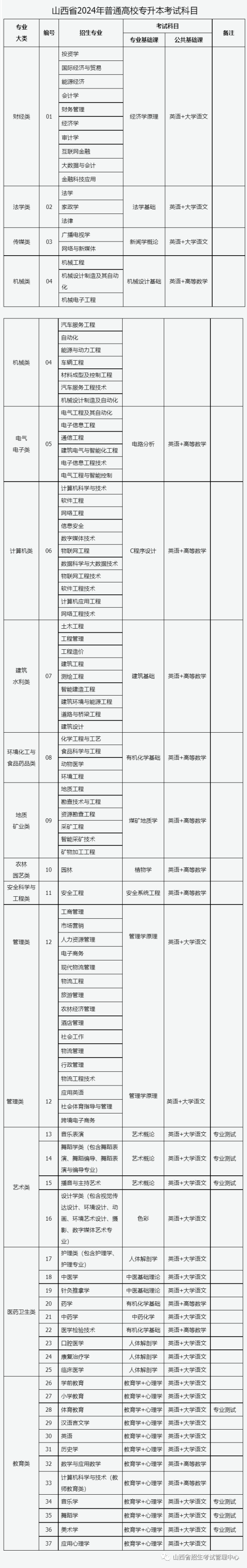 3.考生根据本人所学专业,对照《山西省2024年普通高校专升本本专科对应专业参考目录》《山西省2024年普通高校专升本考试科目》选择报考。其中,报考财经类、法学类、传媒类、机械类、电气电子类、计算机类、建筑水利类、环境化工与食品药品类、地质矿业类、农林园艺类、安全科学与工程类、管理类的考生按照专业大类报考,报考艺术类、医药卫生类、教育类的考生按照专业报考。