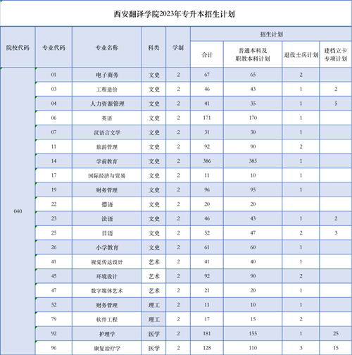 01、西安翻译学院2023年专升本各专业招生计划
