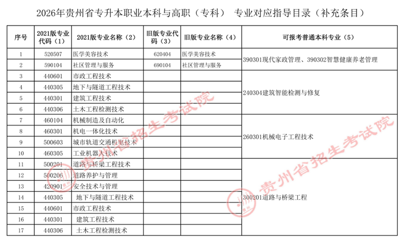 根据《教育部办公厅关于公布2026年本科层次职业教育专业设置备案结果的通知》(教职成厅函〔2026〕5号),贵州省交通职业大学2026年本科层次职业教育专业设置备案工作已完成,从2026年起开始进行专升本招生。结合我省2026年专升本考试招生报名情况,现将2026年贵州省专升本专业对应指导目录补充条目公布如下: