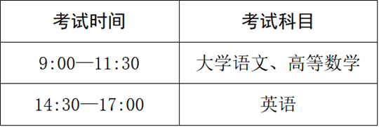 普通高校专升本考试各科满分均为150分,具体考试时间见下表。其中文史、法学、教育、艺术类别上午考大学语文,理工、经管、农学、医学类别上午考高等数学。