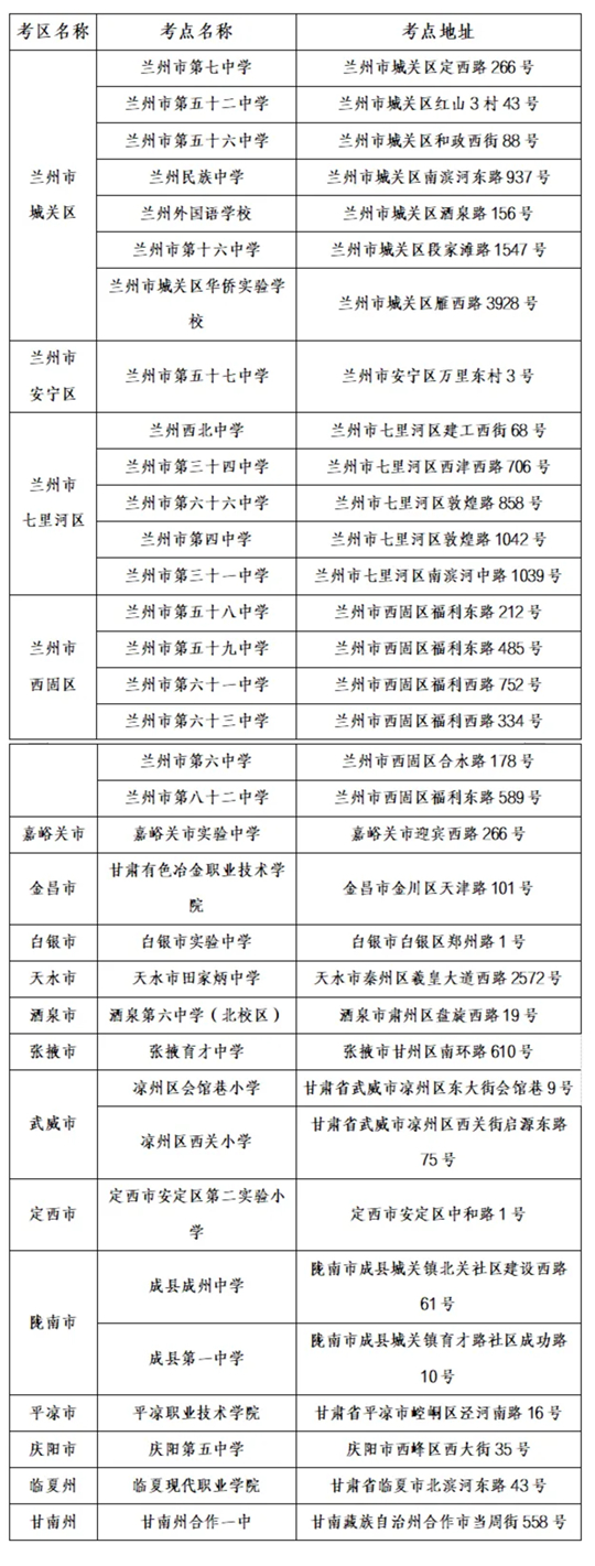 2026年甘肃省普通高校高职(专科)升本科统一考试考点详细地址汇总表
