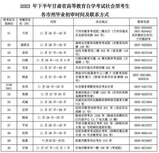 2023年下半年甘肃省高等教育自学考试社会型考生各市州毕业初审时间及联系方式
