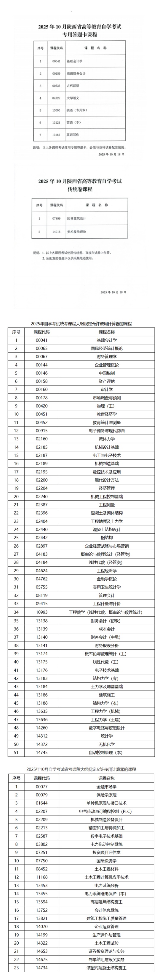 2025年10月陕西省自学考试专用答题卡等课程信息公布