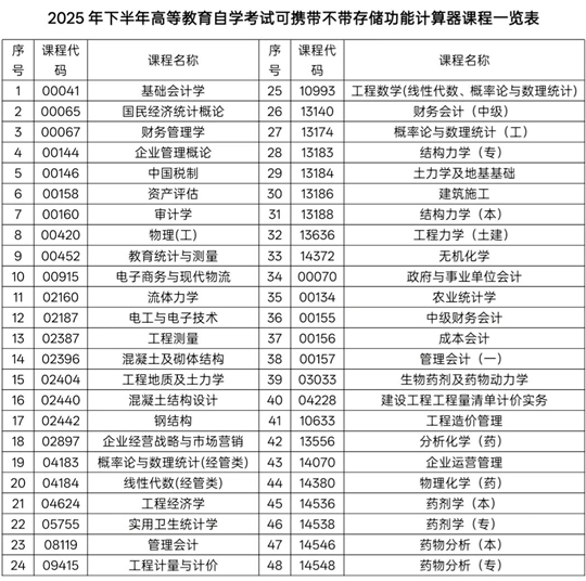 考生可携带不带存储功能的计算器参加部分课程考试,详情见下表。