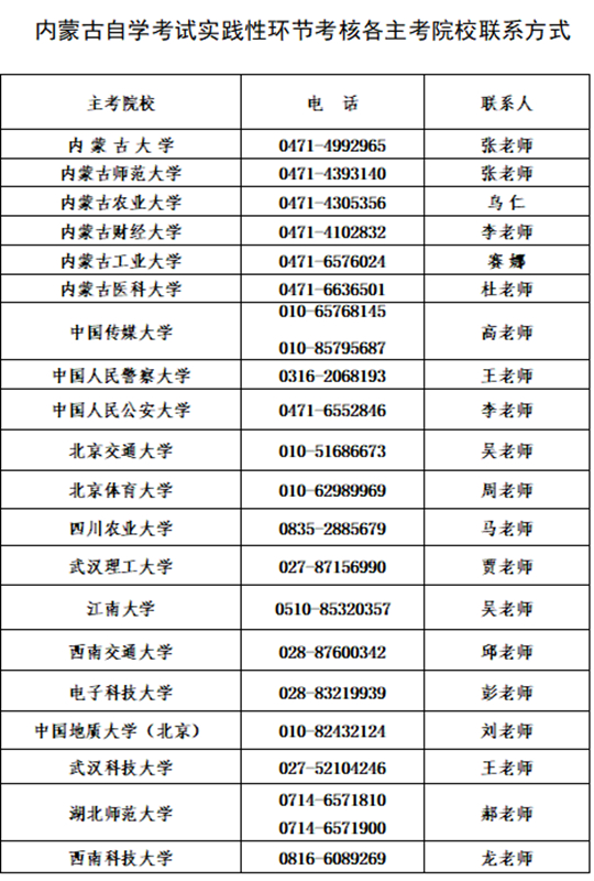 附件2:内蒙古自学考试实践性环节考核各主考院校联系方式