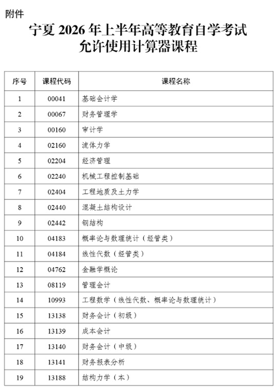 附件:宁夏2026年上半年高等教育自学考试允许使用计算器课程
