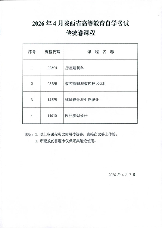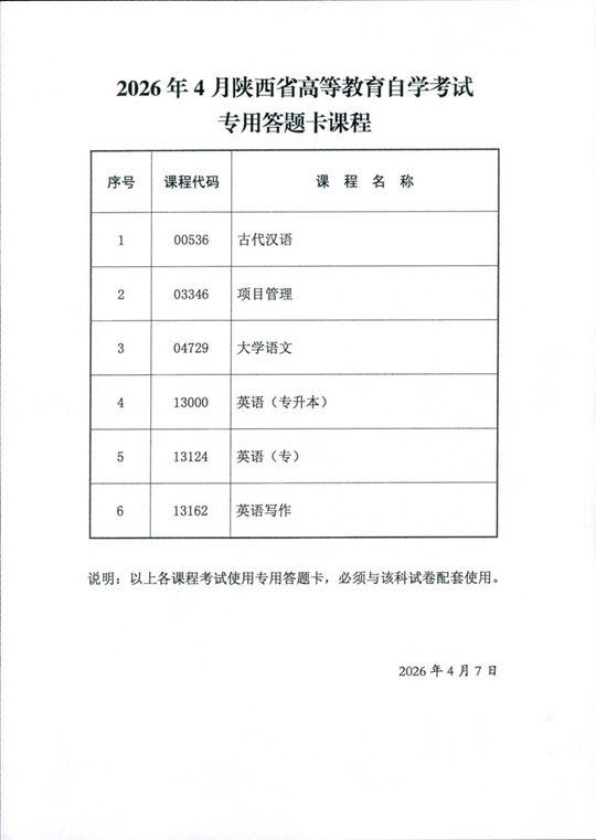 2026年4月陕西省高等教育自学考试专用答题卡课程、传统卷课程